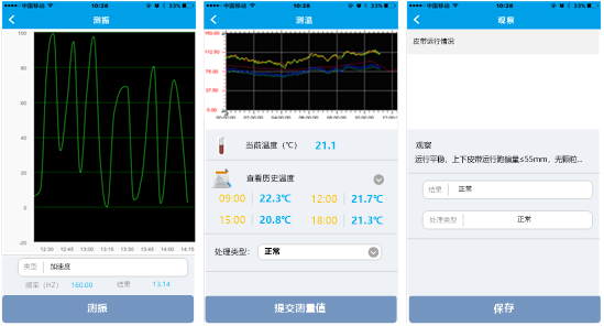 点检设备会对点检设备进行测振、测温等方面的数据测量,同时结合观察法,对设备的运行情况作出准确的判断,设备点检的数据直接通过覆盖厂区的无线WIFI上传到中心服务器的数据库中。